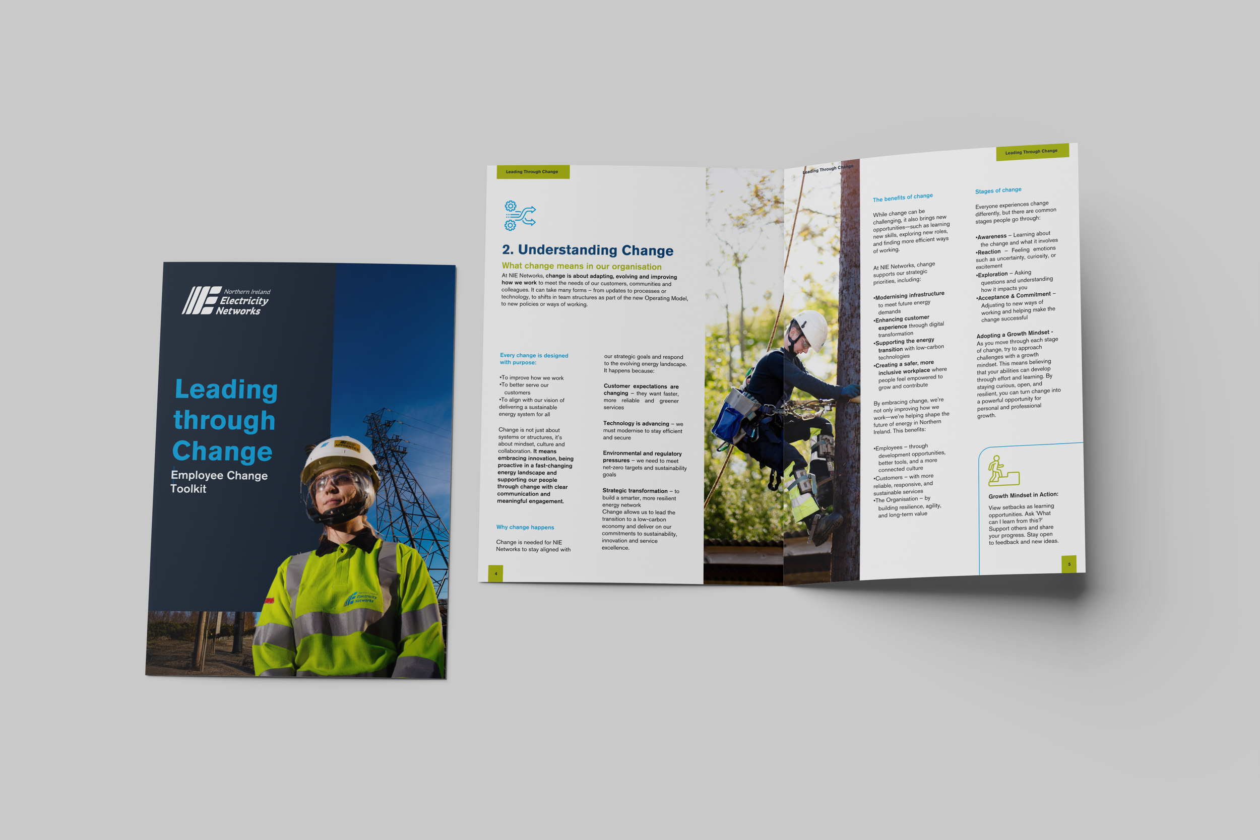 Editorial design and layout for an employee change toolkit—crafted to translate complex messaging into accessible, engaging content through typography, imagery, and structured layouts.